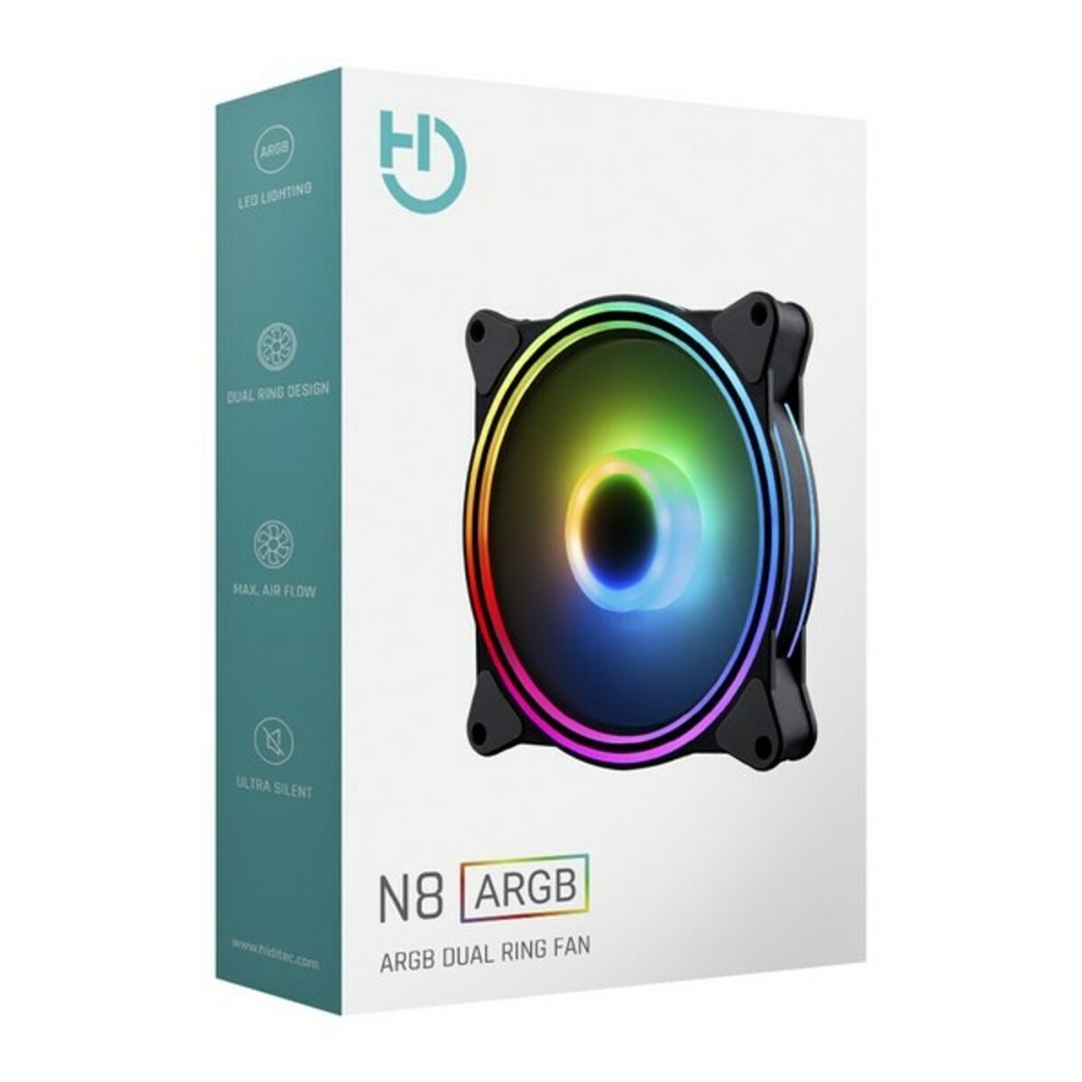 Hiditec N8-ARGB. Suitable for: Computergehäuse, Typ: Ventilator, Lüfter Durchmesse: 12 cm. Produktfarbe: Schwarz, Illumination colour: Multi, Fan connector: 6 Kontakte. Spannung: 12 V, Nennstrom: 0,15 A. Breite: 120 mm, Tiefe: 25 mm, Höhe: 120 mm. Drehgeschw.: 1200 RPM, Luftdruck: 2,32 mmH2O, Geräuschpegel: 22 dB